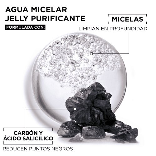 El Agua Micelar con carbón Garnier Pure Active purifica y matifica la piel. Resultados clínicamente probados: En una semana reduce en un 44% las imperfecciones y en un 29% los puntos negros. Sin enjuagues ni residuos. Textura gel - 400 ML